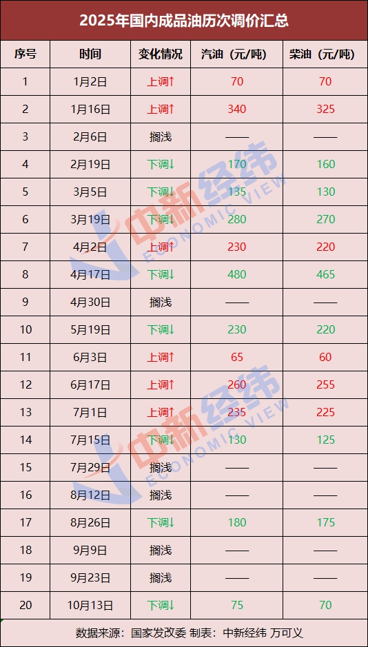 中新经纬10月27日电 (万科一)新一轮成品油调价窗口将于10月27日24:00开启。从综合制度角度看,本次调价可能是今年以来的第九次调价。卓创资讯成品油分析师郑明亚向中新经纬表示,本次定价周期内,宏观环境谨慎,原油期货价格持续低位波动。原油和汽油库存同步下降,原油期货价格出现一段时间的反弹,但难以改变折算率在负区间运行的局面,导致当前成品油零售限价轮换下调的预期加大。 “零售价格上限的四舍五入可能会以向下调整告终。”郑明亚是这样评价的。金联创成品油分析师王山也指出,原油近期呈现出先跌后反弹的走势。受油价普遍下跌影响,本周期变化率呈负值且宽幅变化。据金联创测算,截至10月24日第9个工作日,原油平均参考价为60.44美元/桶,变动率为-6.22%。相应国内汽、柴油零售价格降低290元/吨。汽油、柴油零售价格今年第九次下调,并将如期实施。按目前幅度计算,此时汽柴油价格每升将下降0.22-0.24元左右,大部分车主的燃油成本将进一步降低。其中,在燃油方面,以油箱容量为50升的小型车计算,加满一个油箱将减少约11.5元的支出。中新经纬指出,自年初以来今年以来,国内油价经历了二十轮调整窗口,其中六次上涨、八次下跌、六次搁浅。盈亏相抵后,国内汽油、柴油价格较上年末每吨分别下跌480元和460元。如果实行价格轮换调整,2025年的调价形势将是“六涨、九跌、六滞”。根据“十个工作日”原则,下一轮成品油零售价格调整窗口将于2025年11月10日24:00开启。展望后市,实业家指出,地缘政治紧张局势加剧以及欧美对俄价格上涨将支撑油价短期反弹。中长期供给过剩压力仍将持续,油价仍将保持大幅波动。隆中资讯成品油分析师刘丙娟表示,巴勒斯坦、以色列、俄罗斯和乌克兰之间的局势不稳定。欧美持续对部分产油国实施制裁,但OPEC+增加带来的长期供应过剩风险难以消除。长期博弈下,预计下一轮成品油价格调整搁浅的可能性较大。 。